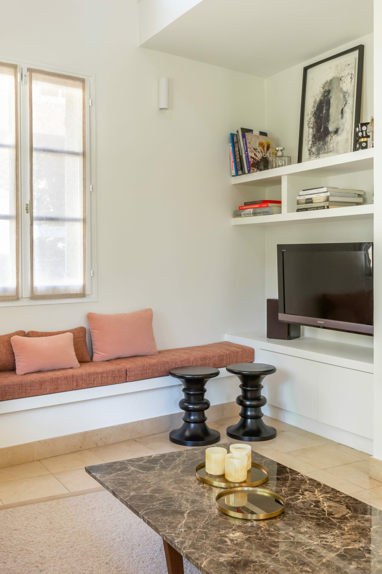 « En plus de la décoration et de la rénovation, nous avons créé une bibliothèque sur mesure pour cet intérieur autrefois sombre et froid. Après l’avoir louée pendant des années, les propriétaires la récupéraient pour y vivre mais s’y sentaient mal à l’aise sans savoir quelles actions mener.