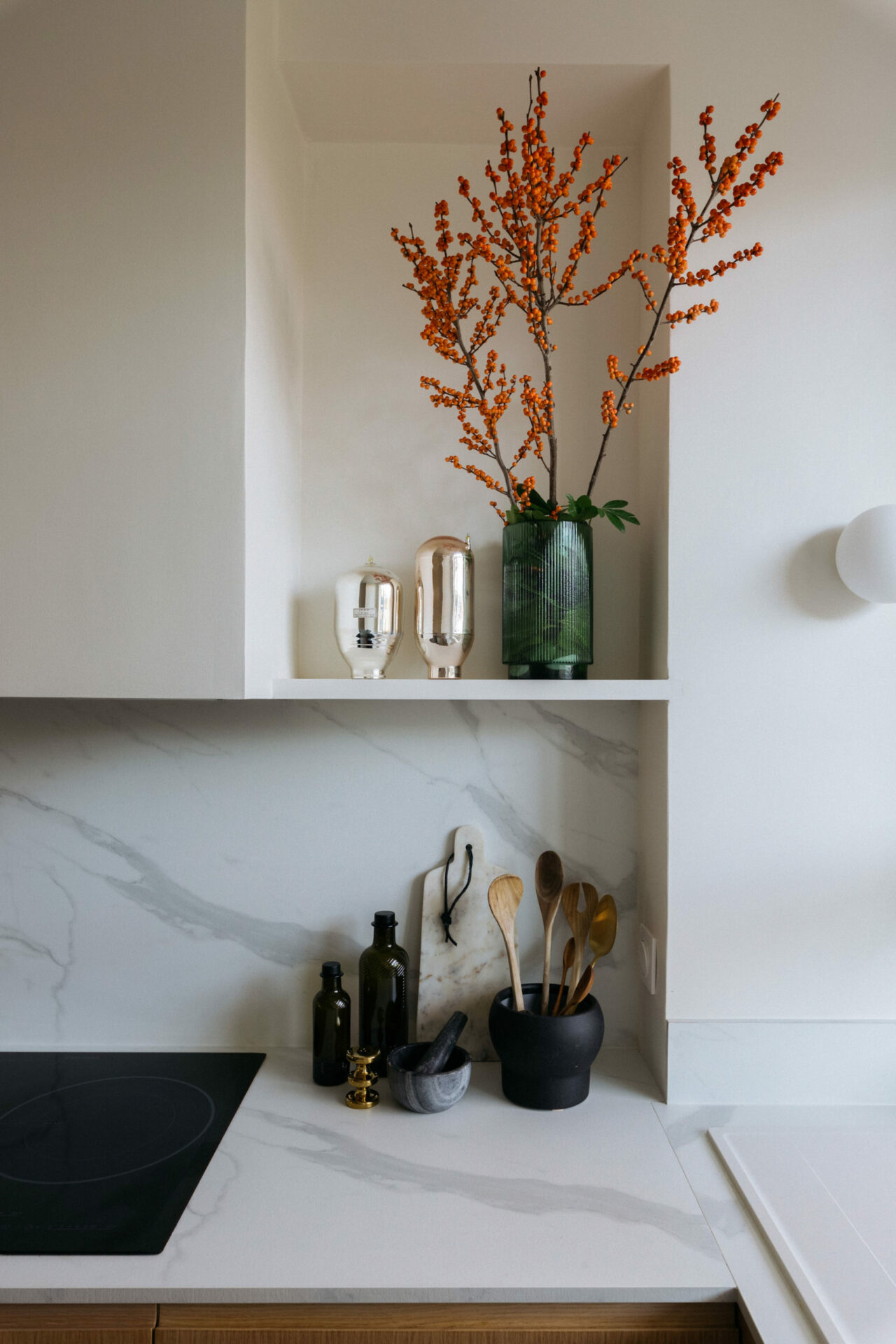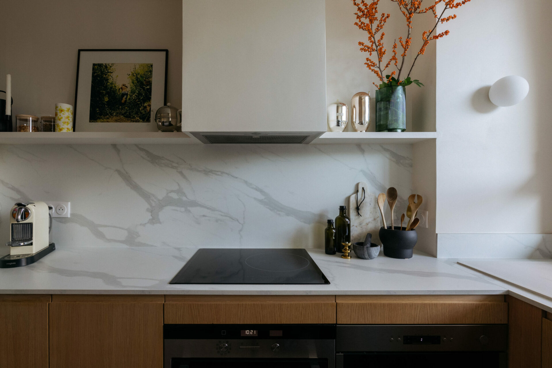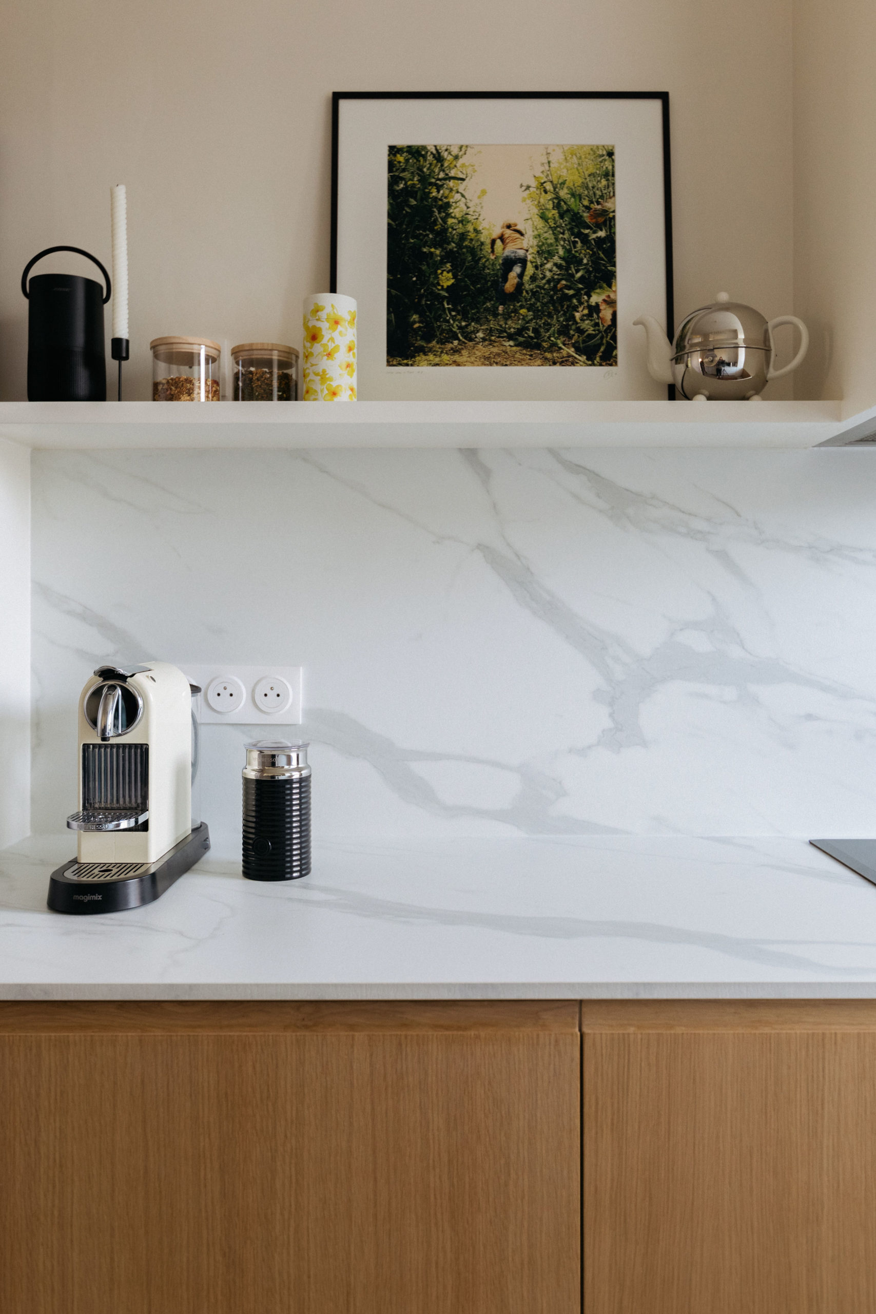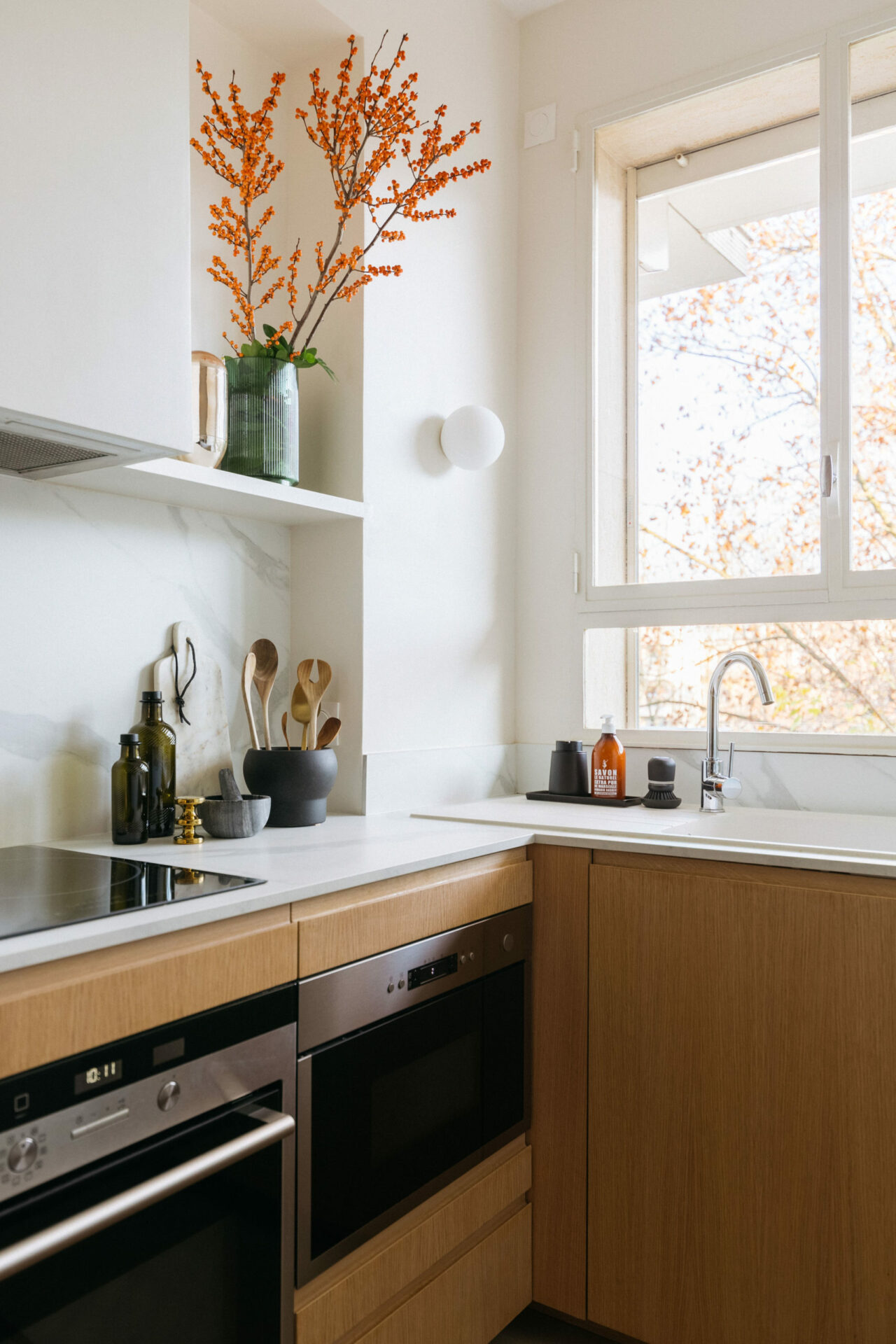 Le travail de l’architecte a été de transformer le plan de la pièce afin de permettre une circulation plus fluide et d’alléger l’ensemble du mobilier. L’objectif aussi était d’apporter de la douceur grâce aux façades en chêne, des plans de travail effet marbre et un sol en béton ciré.